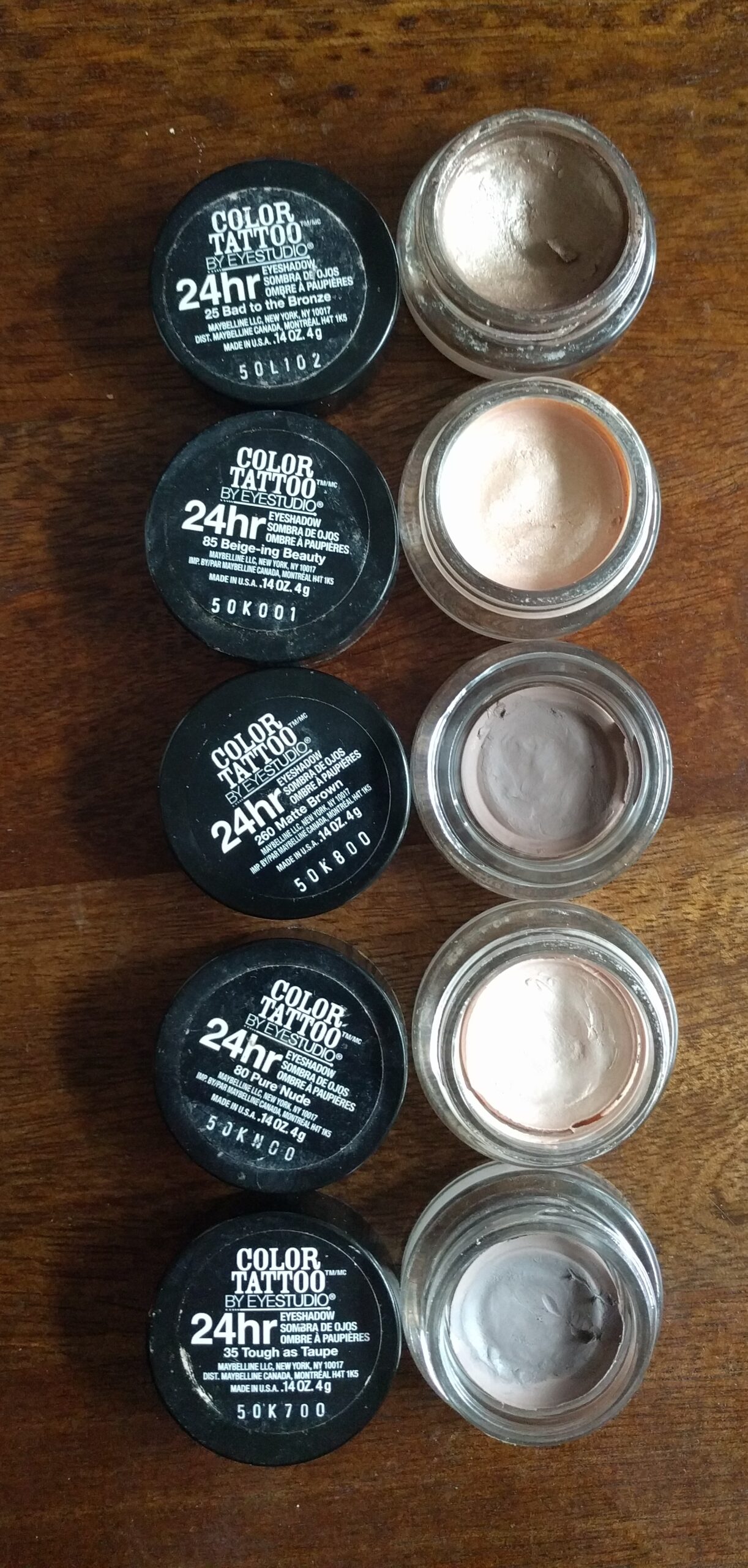 Maybelline Color Tattoo 24HR Matte Collection (Beige-ing Beauty, Matte Brown, Pure Nude, Tough as Taupe) and Regular (Bad to the Bronze). – You can tell I just loved these products by how untouched they look. I bought these when they came out as limited edition years ago,and I barely used any of the mattes other than occasionally the nude as a base. Bad to the Bronze was the most used out of the 5. However, the longer I had it in my collection, the clumpier it looked on my eyes. Again, I have palettes that have this colour, so it’s not a huge loss, and I prefer sticking with pressed powdered shadows now.