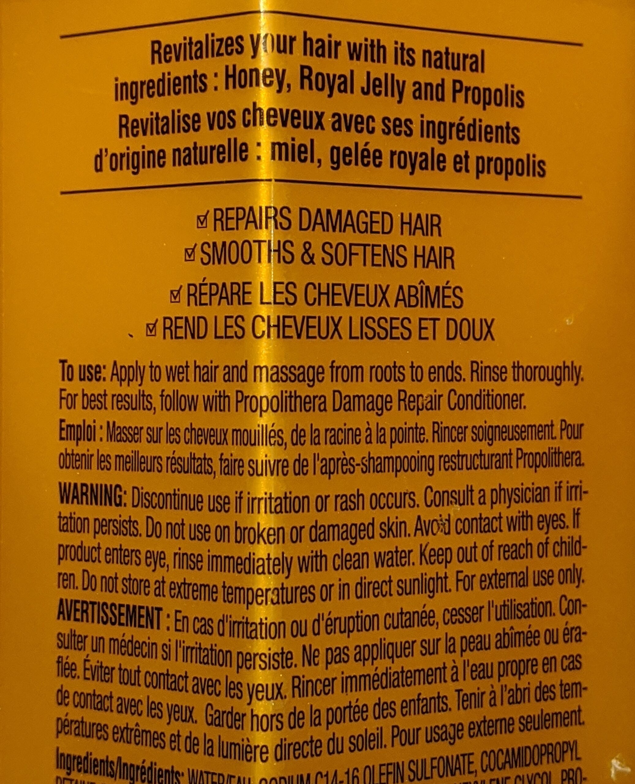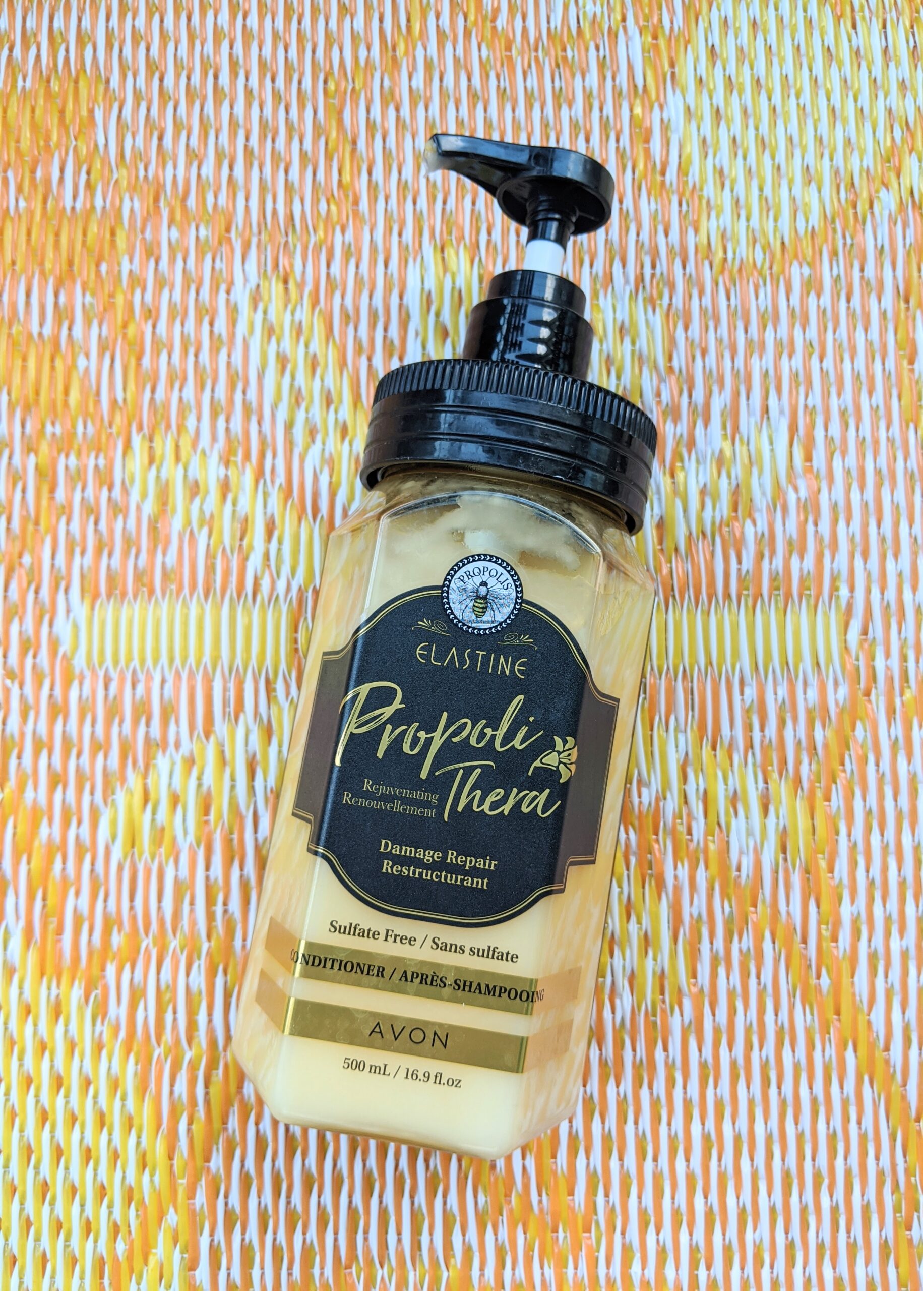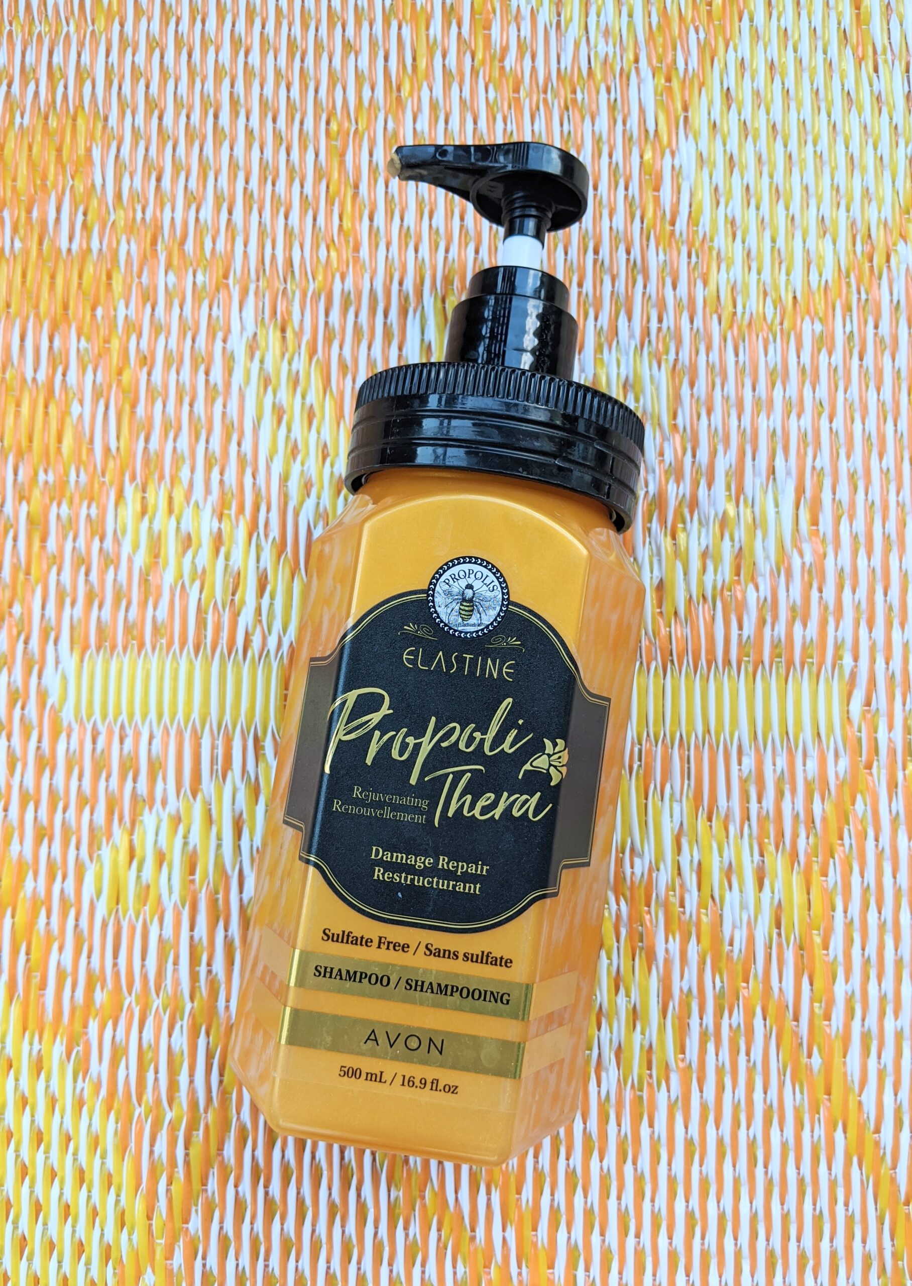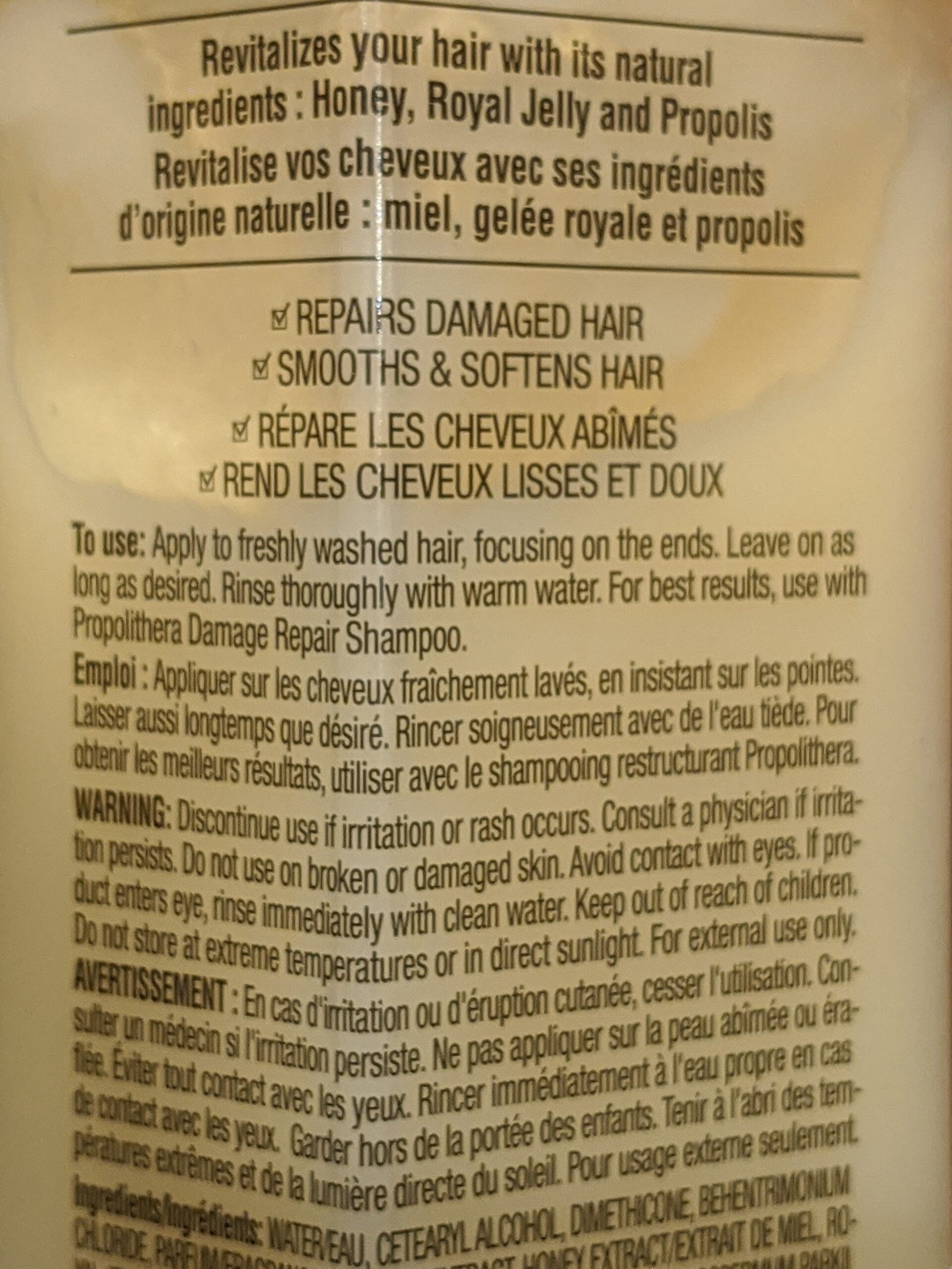 SHAMPOO/CONDITIONER: Catch the buzz. Beeswax, honey and royal jelly (what bees eat) combine with vitamins and amino acids to form this rejuvenating shampoo/conditioner. Treat your tresses to our soothing formula, which will repair damaged hair while giving it a smooth and manageable appearance. Benefits: Repairs damaged hair, Smooths & softens hairHAIR MASK: Catch the buzz. Treat your tresses to our rejuvenating hair mask, made with beeswax, honey and royal jelly (what bees eat). This nutrient-enriched formula will help deeply nourish your hair and repair damaged split-ends. Benefits: Infused with nutrients and antioxidants that help provide deep nutrition and protection from heat and damageOur Elastine PropoliThera is formulated to add new life to your hair. Free of sulfates and parabens, it infuses every strand with healthy-looking body and shine.ADDITIONAL CLAIMS:– Avon.ca