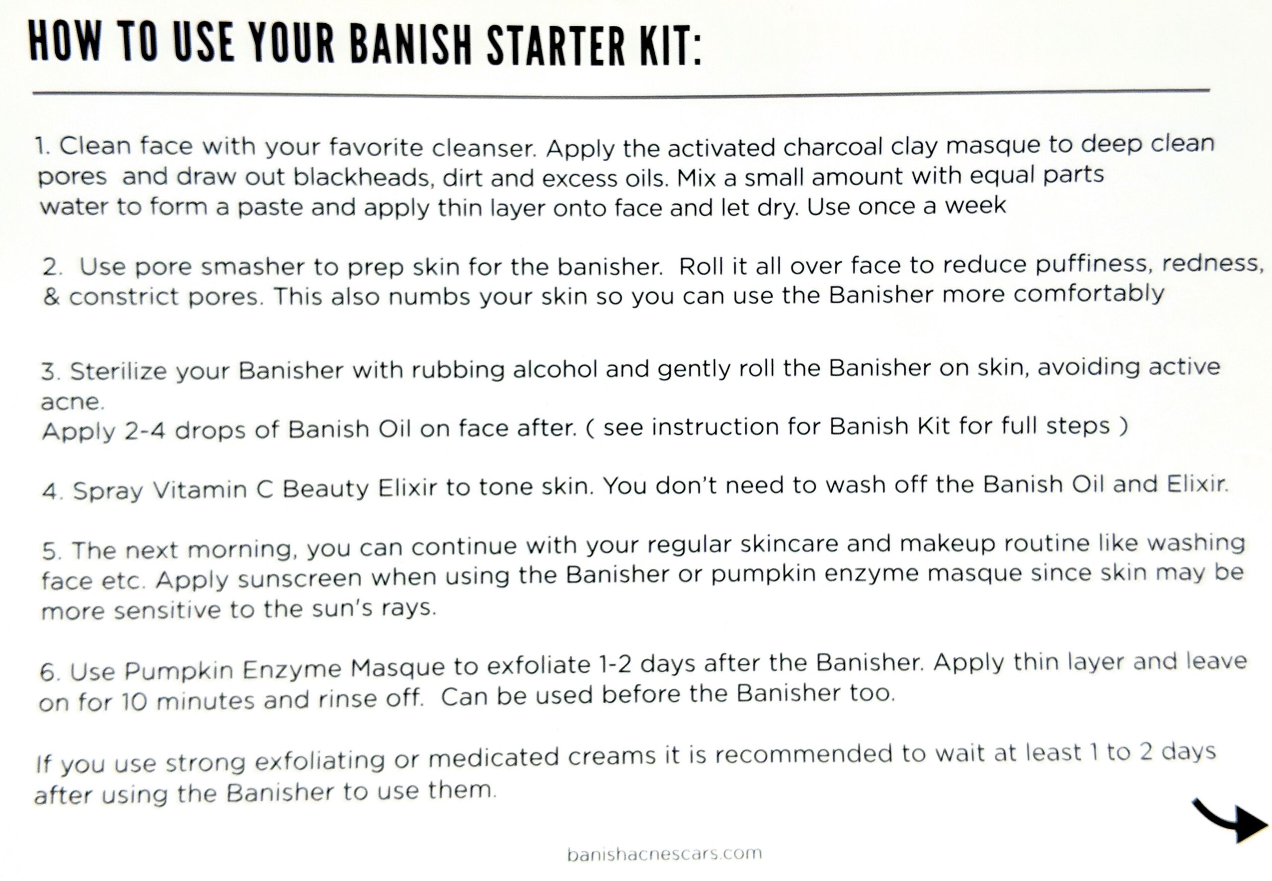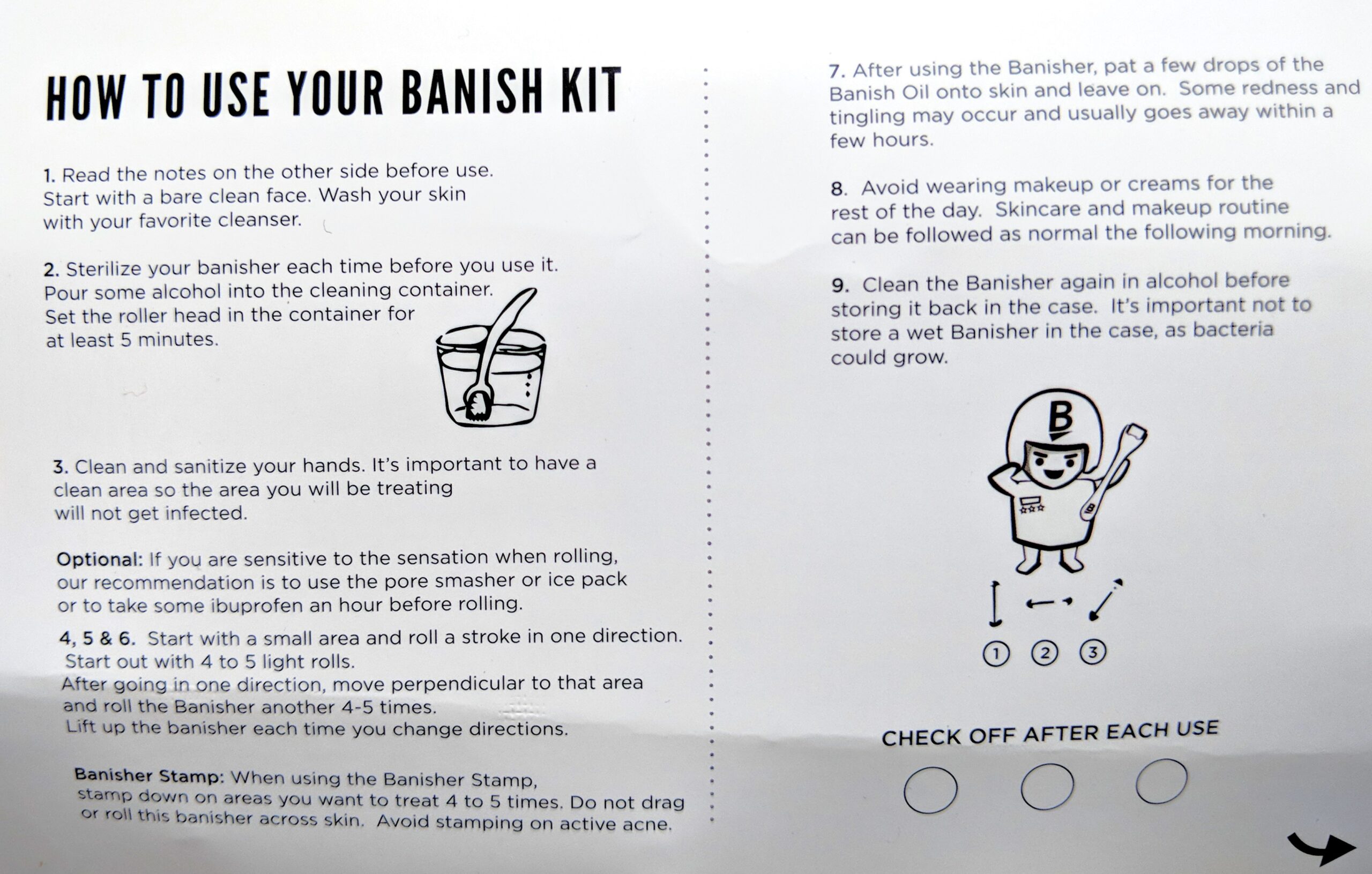 Banish’s website was not enough for me to understand how to use this product efficiently and safely. I found a really good video by an Australian dermatologist demonstrating how to use a dermaroller on yourself, what to expect, and what to avoid. The two Banishers were in individually sealed packages and already sterile. Banish recommends you soak them in alcohol as a precaution measure to always ensure that the Banishers are properly sterile before use (the kit comes with a little plastic container for this).