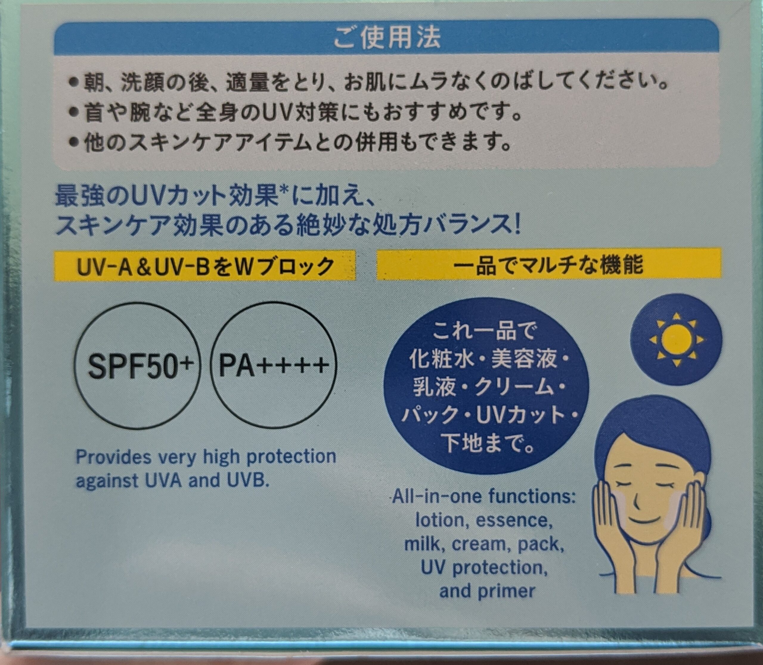 Rohto Skin labs Gokujyun SPF50+ PA++++ UV White Gel can be used as an all-in-one face lotion, beauty milk, beauty serum, cream, or masking lotion. With the added feature of being UV blocking and also as liquid foundation, this amazing gel has 7 functions!