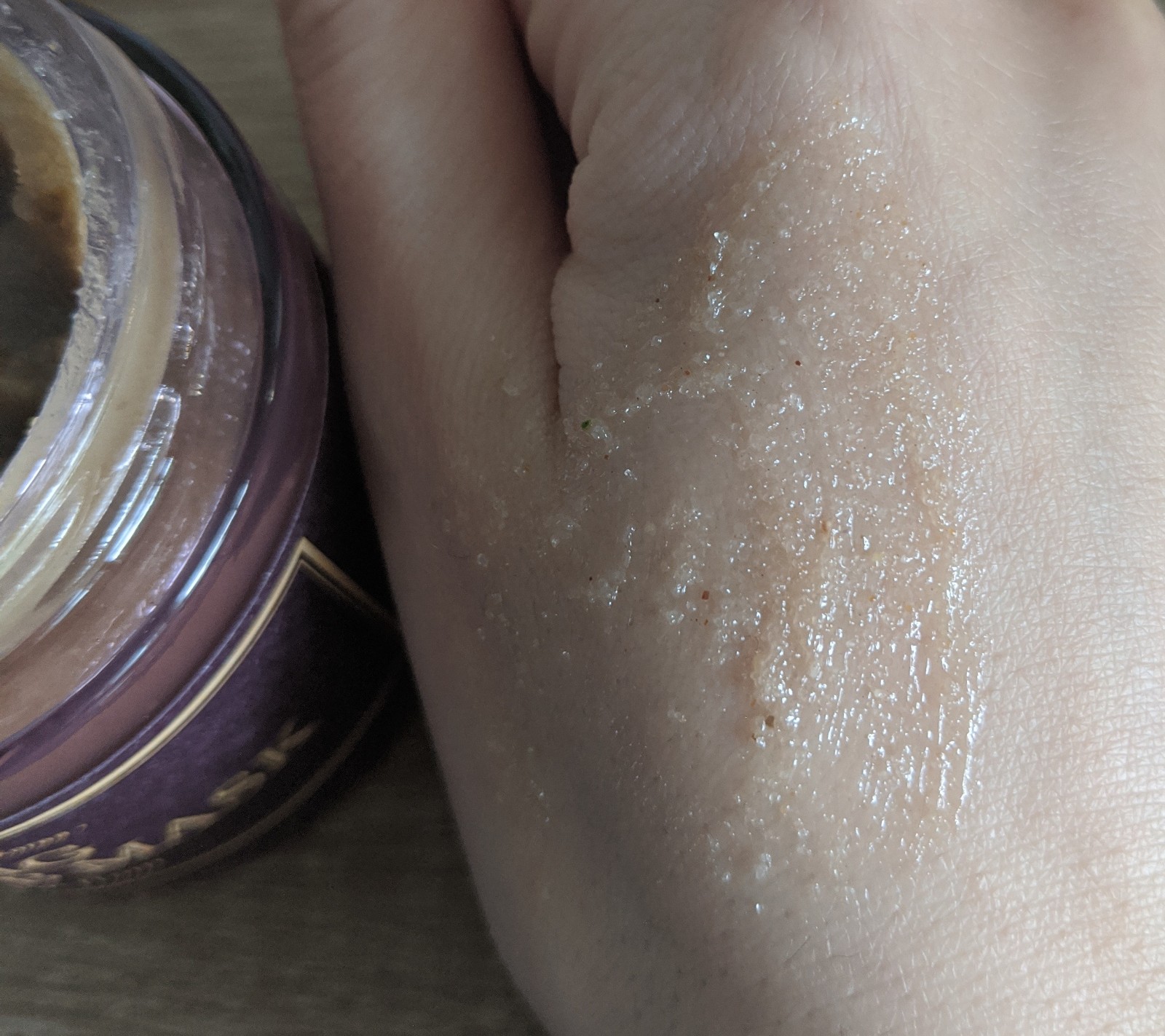Application: Covered face and neck in a thin layer and left it for 5-10 minutes. With wet fingers, massaged skin gently and the scrub emulsified.