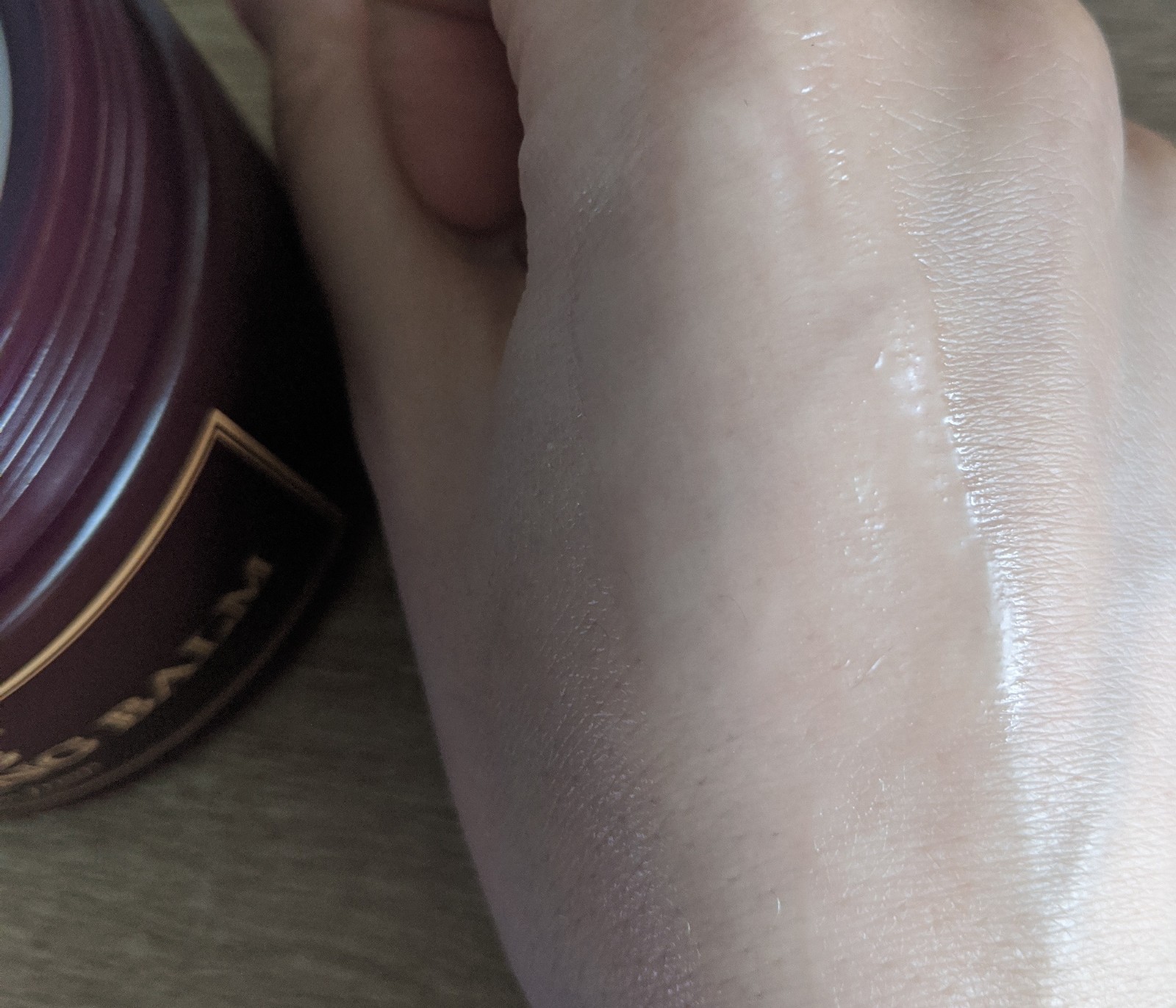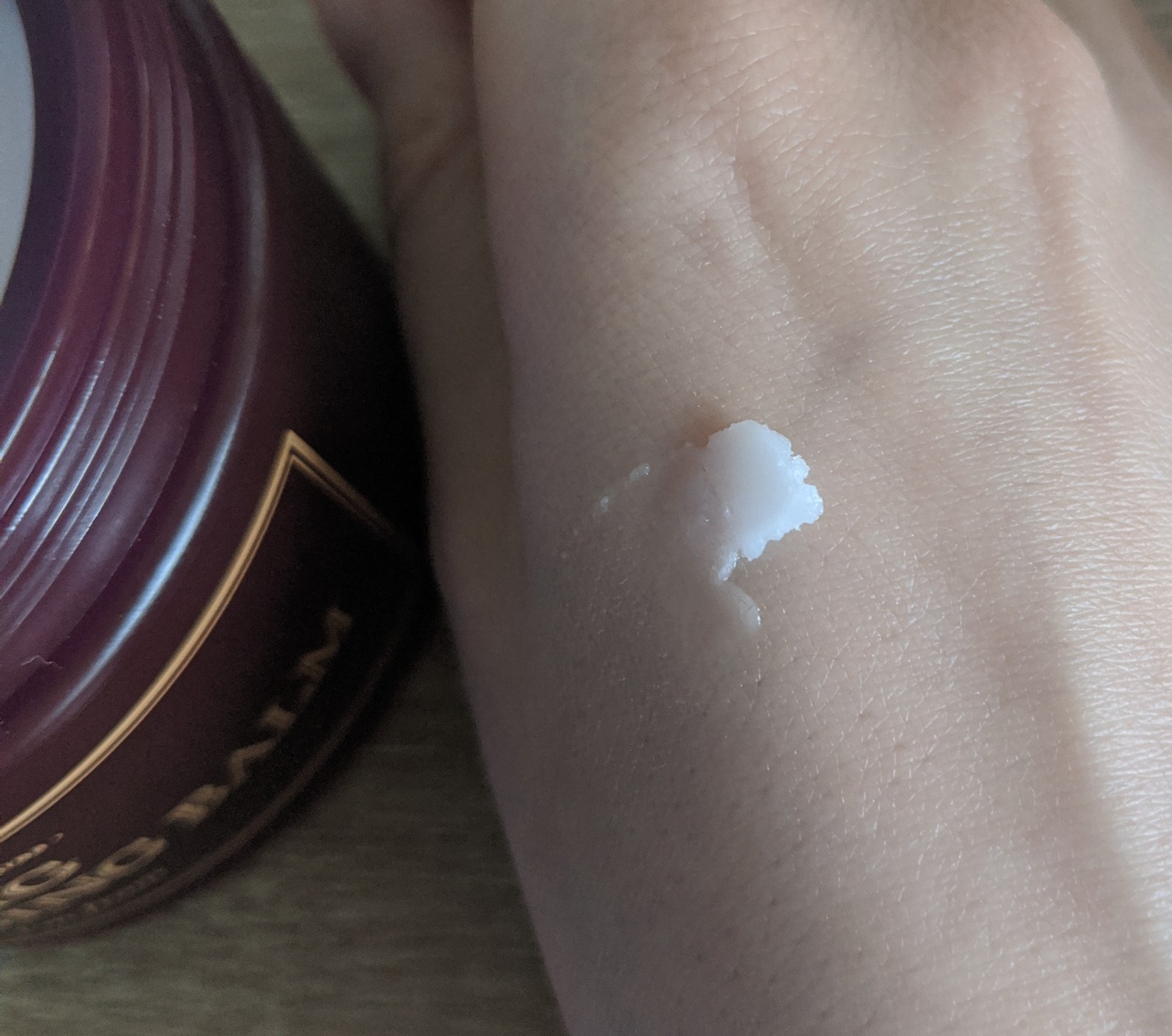 Application: Nickel-size scoop, melt between fingers and gently massage all over face and neck. Fragrance does not linger for long. With wet fingers, massaged face again and product emulsifies.