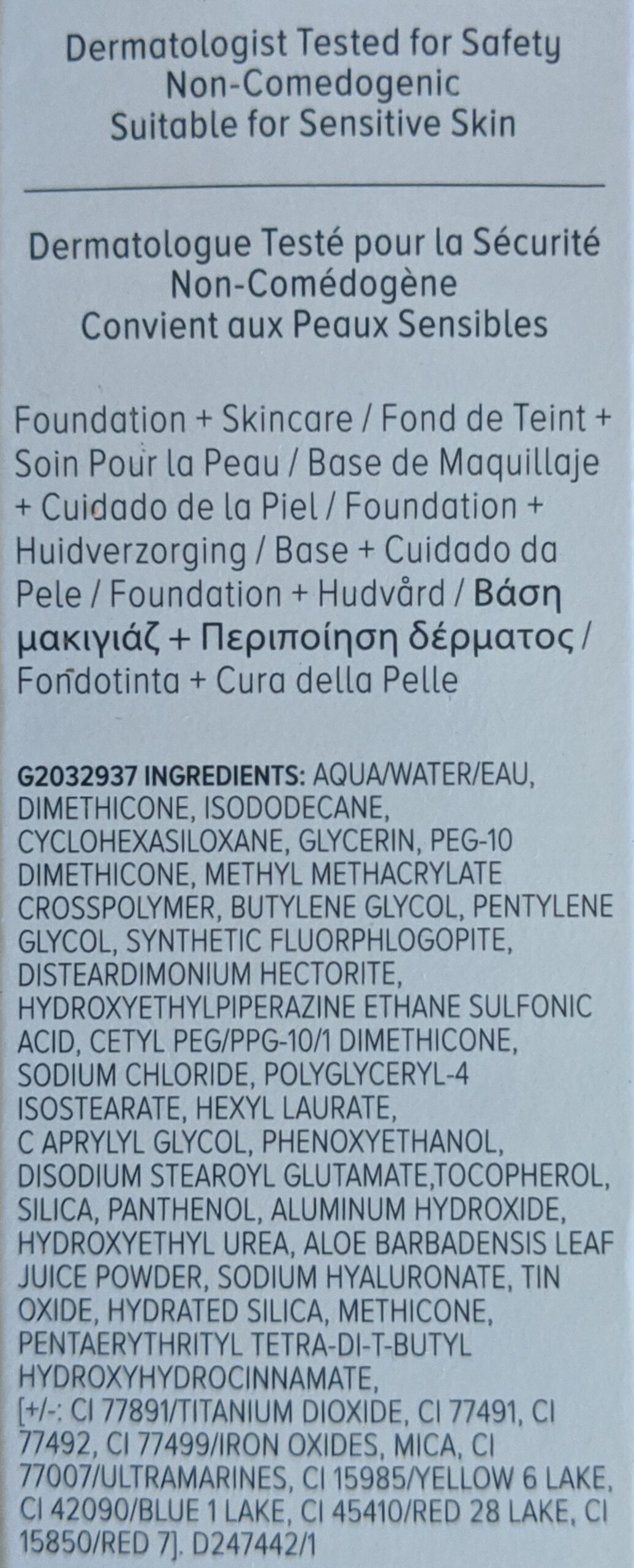 AQUA/WATER/EAU, DIMETHICONE, ISODODECANE, CYCLOHEXASILOXANE, GLYCERIN, PEG-10 DIMETHICONE, METHYL METHACRYLATE CROSSPOLYMER, BUTYLENE GLYCOL, PENTYLENE GLYCOL, SYNTHETIC FLUORPHLOGOPITE, DISTEARDIMONIUM HECTORITE, HYDROXYETHYLPIPERAZINE ETHANE SULFONIC ACID, CETYL PEG/PPG-10/1 DIMETHICONE, SODIUM CHLORIDE, POLYGLYCERYL-4 ISOSTEARATE, HEXYL LAURATE, CAPRYLYL GLYCOL, PHENOXYETHANOL, DISODIUM STEAROYL GLUTAMATE, TOCOPHEROL, SILICA, PANTHENOL, ALUMINUM HYDROXIDE, HYDROXYETHYL UREA, ALOE BARBADENSIS LEAF JUICE POWDER, SODIUM HYALURONATE, TIN OXIDE, HYDRATED SILICA, METHICONE, PENTAERYTHRITYL TETRA-DI-T-BUTYL HYDROXYHYDROCINNAMATE, [+/-: CI 77891/TITANIUM DIOXIDE, CI 77491, CI 77492, CI 77499/IRON OXIDES, MICA, CI 77007/ULTRAMARINES, CI 15985/YELLOW 6 LAKE, CI 42090/BLUE 1 LAKE, CI 45410/RED 28 LAKE, CI 15850/RED 7]. D247442/1