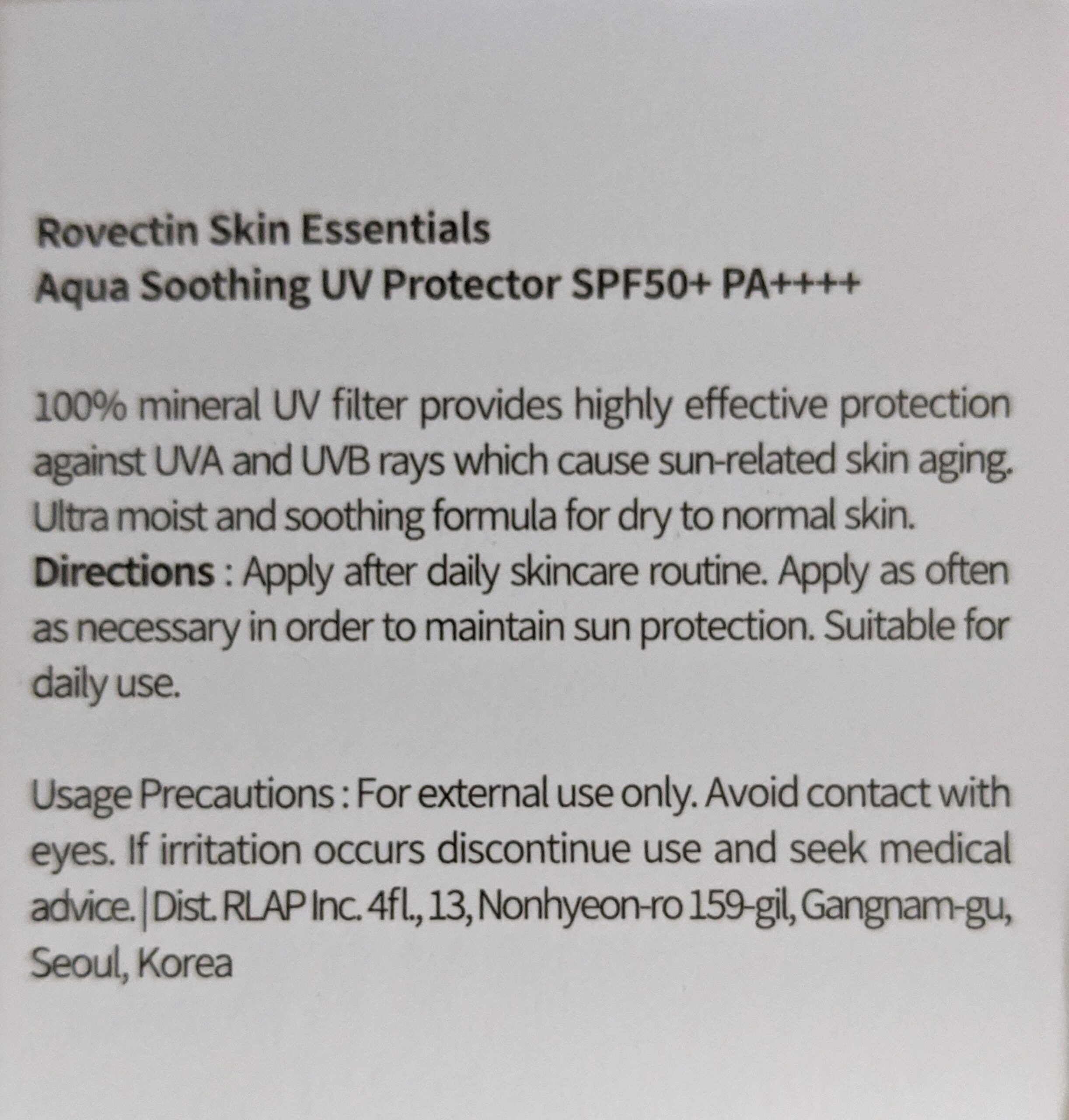 It was quite fortunate timing when I received this sunscreen for review; A couple of weeks prior, I watched a Korean Dermatologist feature Rovectin Skin Essentials Aqua Soothing UV Protector in his daily routine. I kept it on my wishlist since then, for it looked like a 100% mineral sunscreen that would be cosmetically elegant and not casty.