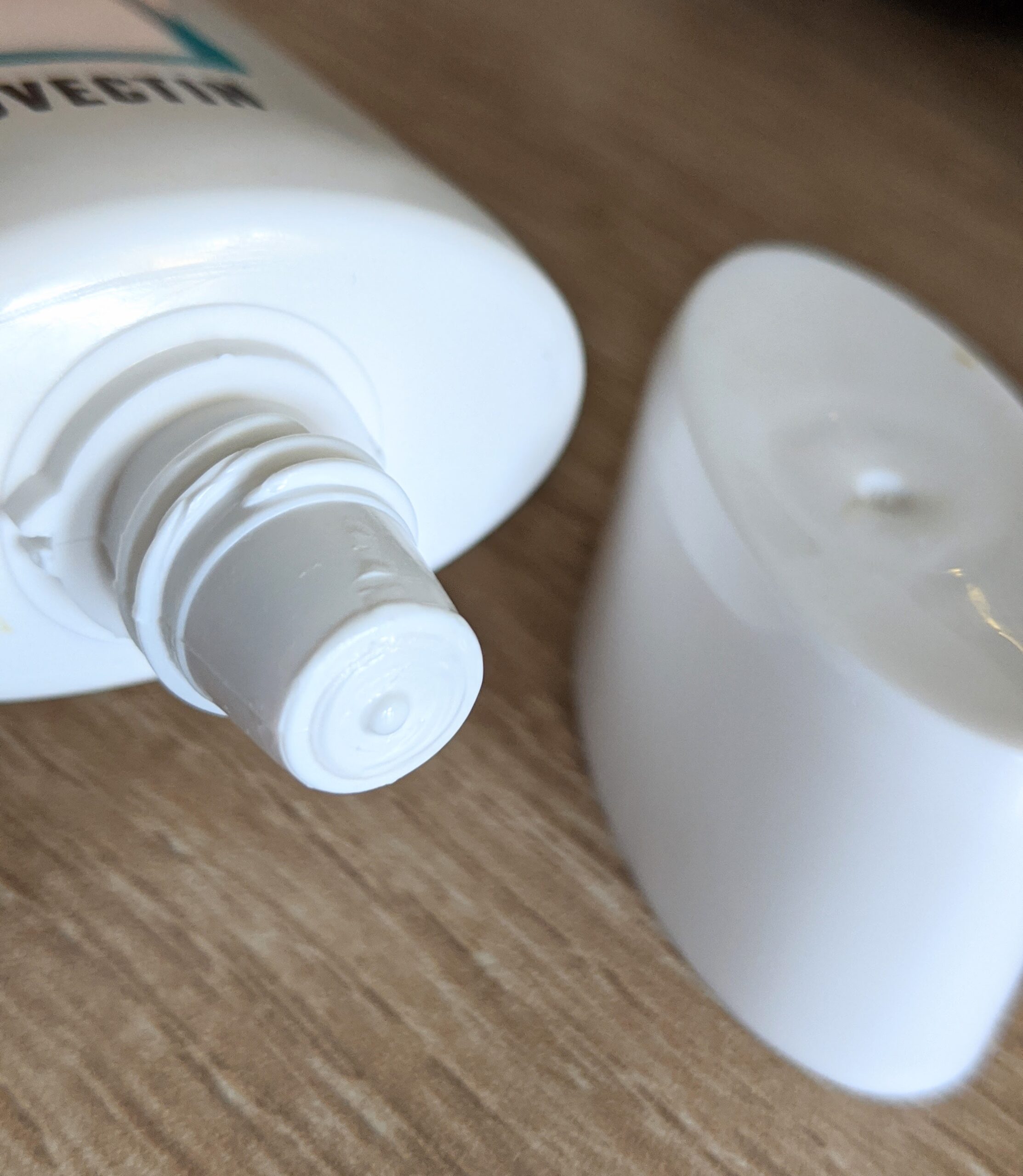 PACKAGING: Opaque white plastic tube with small spout, twist off cap.